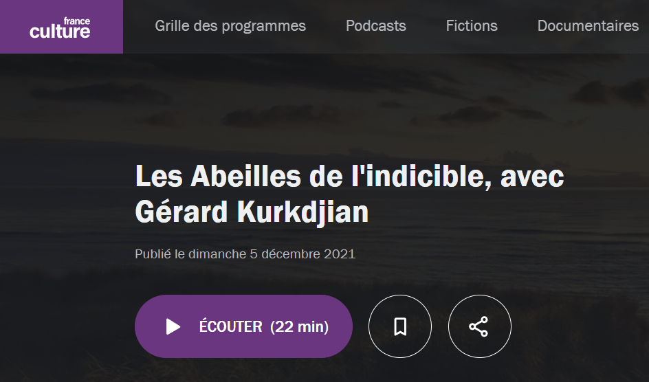 Gérard Kurkdjian : musicien, initiateur de créations où poésies et textes des grandes voies mystiques s’entrecroisent avec les traditions musicales d’Occident et d’Orient, auteur, conférencier, récitant, producteur d’émissions de radio, organisateur de colloques. Auteur du Grand Livre des Musiques Sacrées du Monde, Il est également l’auteur d’un recueil de poésies : Abeilles de l’Indicible et d’un roman : Raga de Nuit, « Passion sur le Gange » et vient de publier son dernier recueil de poésie : L’Autre monde.