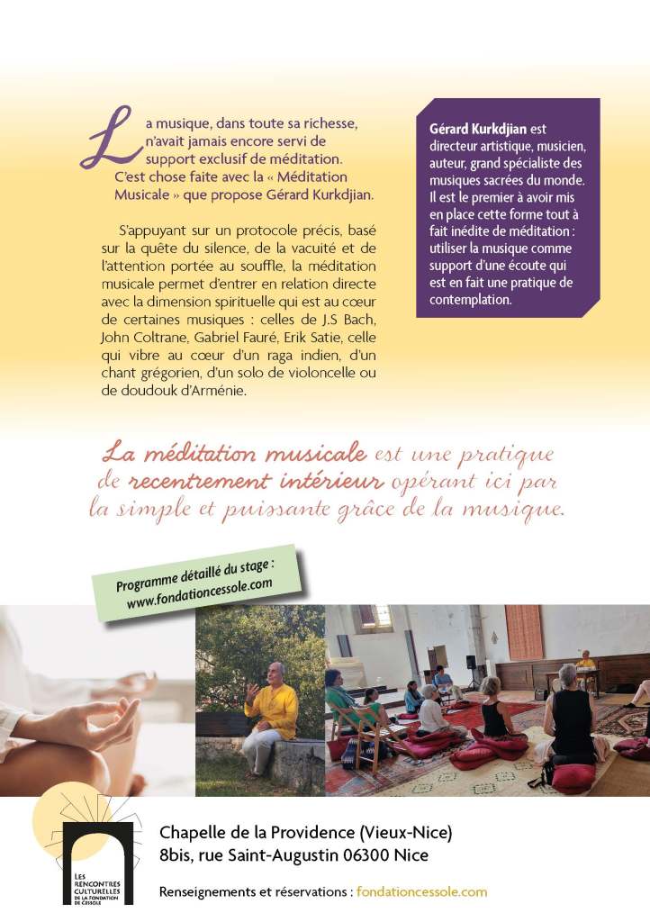S’appuyant sur un protocole précis, basé sur la quête du silence, de la vacuité et de l’attention portée au souffle, la méditation musicale permet d’entrer en relation directe avec la dimension spirituelle qui est au cœur de certaines musiques : celles de J.S Bach, John Coltrane, Gabriel Fauré, Erik Satie, celle qui vibre au cœur d’un raga indien, d’un chant grégorien, d’un solo de violoncelle ou de doudouk d’Arménie.